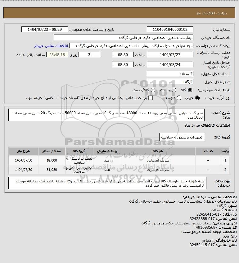 | 1 | -- | سرنگ انسولین | عدد | تجهیزات پزشکی و سلامت | 18,000 | 1404/07/30 |