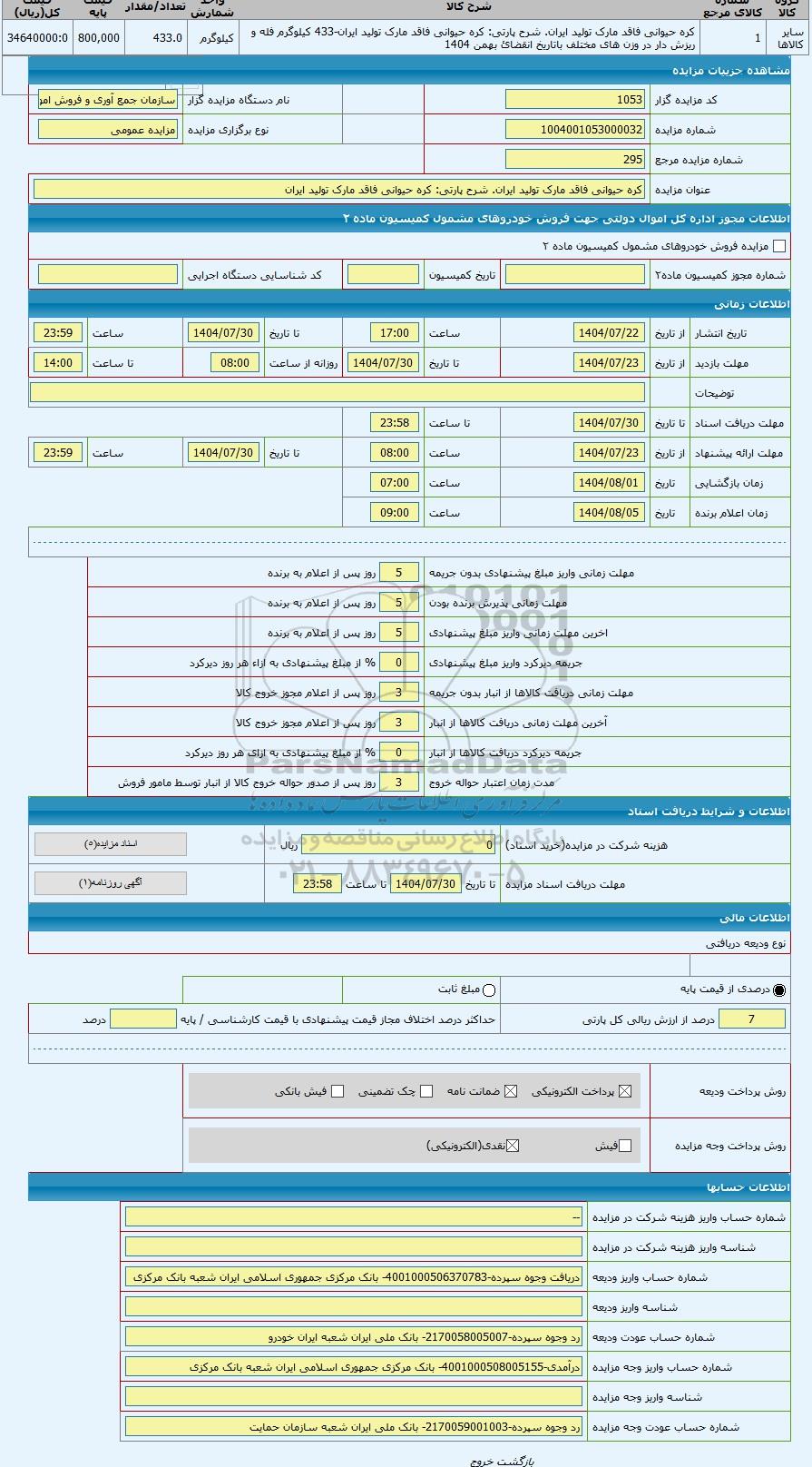 | عنوان مزایده | کره حیوانی فاقد مارک تولید ایران | |||