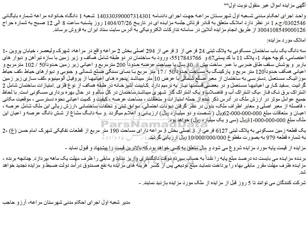 واحد اجرای احکام مدنی شعبه اول شهرستان مراغه جهت اجرای دادنامه 140330390007314301 شعبه 1 دادگاه خانواده مراغه شماره بایگانی 0302546/ج.م 1 در نظر دارد املاک متعلق به قادر فرتاش جلسه مزایده ای در تاریخ 1404/07/26 روز پشنبه ساعت 8 الی 12 صبح به شماره حراج 3004108549000126 از طریق انجام مزایده آنلاین در سامانه تدارکات الکترونیکی به آدرس سایت ستاد ایران به فروش برساند.