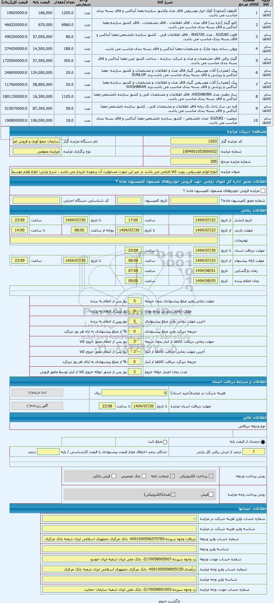 | کد مزایده گزار | 1053 | نام دستگاه مزایده گزار | سازمان جمع آوری و فروش اموال تملیکی | |