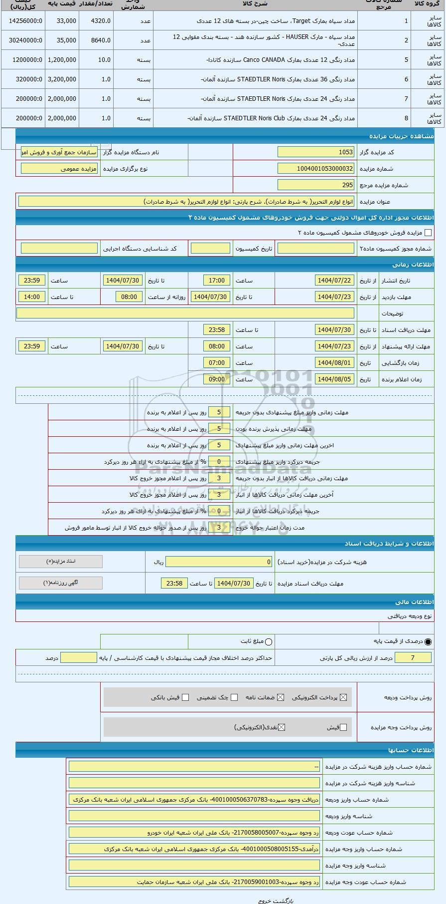 | عنوان مزایده | انواع لوازم التحریر( به شرط صادرات) | |||