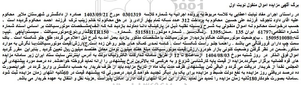 در راستای اجرای مفاد نیابت اعطایی به کلاسه مربوط به پرونده اجرائیه به شماره کلاسه 0301319 مورخ 1403/09/21 صادره از دادگستری شهرستان ملایر محکوم علیه اقای داود تاجوک فرزند علی حسین محکوم به پرداخت 312 عدد سکه تمام بهار آزادی و در حق محکوم له خانم زینب ترک فرزند احمد محکوم گردیده است ، حسب درخواست محکوم له اموال منقولی به شرح وسیله نقلیه ذیل در پارکینک دانا دماوند بازدید که که الف)مشخصات موتورسیکلت بر اساس اسناد شماره گذاری:نوع:موتورسیکلت - سیستم:آپاچی -تیپ:rtr150 - شماره انتظامی:61797 ایران 135 -مدل:1395 -رنگ:سبز - شماره موتور:5115811 -شماره تنه:1509510080 ، ب)وضعیت موتورسیکلت هنگام بازدید:از موتورسیکلت با مشخصات مذکور بازدید بعمل آمد،به شرح ذیل اعلام می گردد: طلق جلو شکسته است - باک سمت چپ دارای فرورفتگی می باشد - راهنما جلو راست شکسته است - کاسه نمدی کمک های جلو روغن زده است.ج)ارزش/قیمت موتورسیکلت:با نگرش به موارد مذکور،ضمن در نظر گرفتن وضعیت کنونی بازار خودرو،ارزش/قیمت موتورسیکلت مبلغ هفتاد میلیون تومان معادل هفتصد میلیون ریال تعیین گردید . بنابراین مقرر گردید اموال فوق الذکر در روز شنبه مورخ 1404/08/03 ازساعت8 تا 12 از طریق سامانه تدارکات الکترونیک دولت به آدرس اینترنتی سایت ستاد ایران زیر سامانه مزایده های قوه قضائیه برگزار میگردد.مزایده از قیمت پایه کارشناسی شروع و به هرکسی که بالاترین نرخ پیشنهادی را ارائه نماید فروخته خواهدشد. ده درصد مورد پیشنهادی فی المجلس نقداً از خریدار دریافت می گردد و الباقی ثمن پیشنهادی ظرف مدت یک ماه از تاریخ مزایده باید از طرف خریدار به حساب دادگستری واریز گردد در غیراینصورت ده درصد دریافتی روز مزایده به نفع دولت ضبط و مزایده برای یک بار دیگر تجدید خواهد گردید. درصورتی که پیشنهاد قیمت در 60ثانیه انتهای زمان مزایده ثبت شود ،سامانه بصورت خودکار180ثانیه زمان مزایده را تمدید می نماید .تکرار این امرتا انتهای وقت اداری امکان پذیراست .هزینه نقل و انتقال به عهده خریدار می باشد.