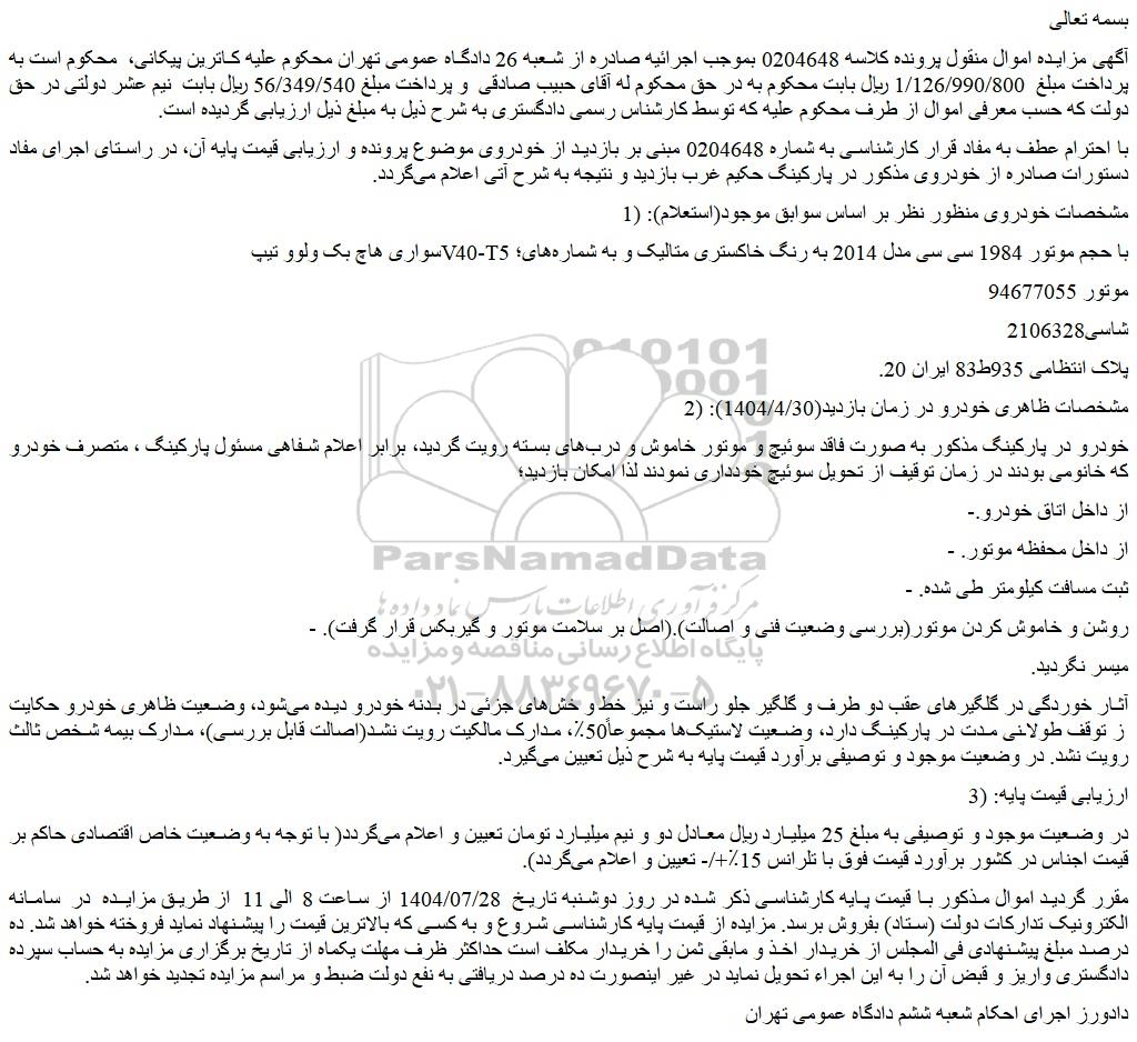 با احترام عطف به مفاد قرار کارشناسی به شماره 0204648 مبنی بر بازدید از خودروی موضوع پرونده و ارزیابی قیمت پایه آن، در راستای اجرای مفاد دستورات صادره از خودروی مذکور در پارکینگ حکیم غرب بازدید و نتیجه به شرح آتی اعلام می گردد.