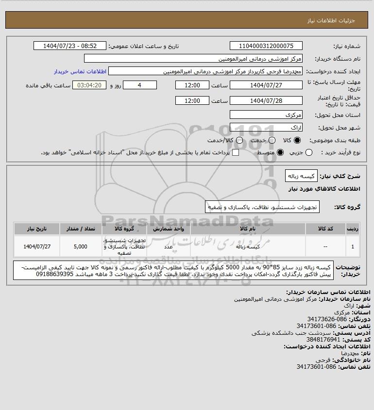 | 1 | -- | کیسه زباله | عدد | تجهیزات شستشو، نظافت، پاکسازی و تصفیه | 5,000 | 1404/07/27 |