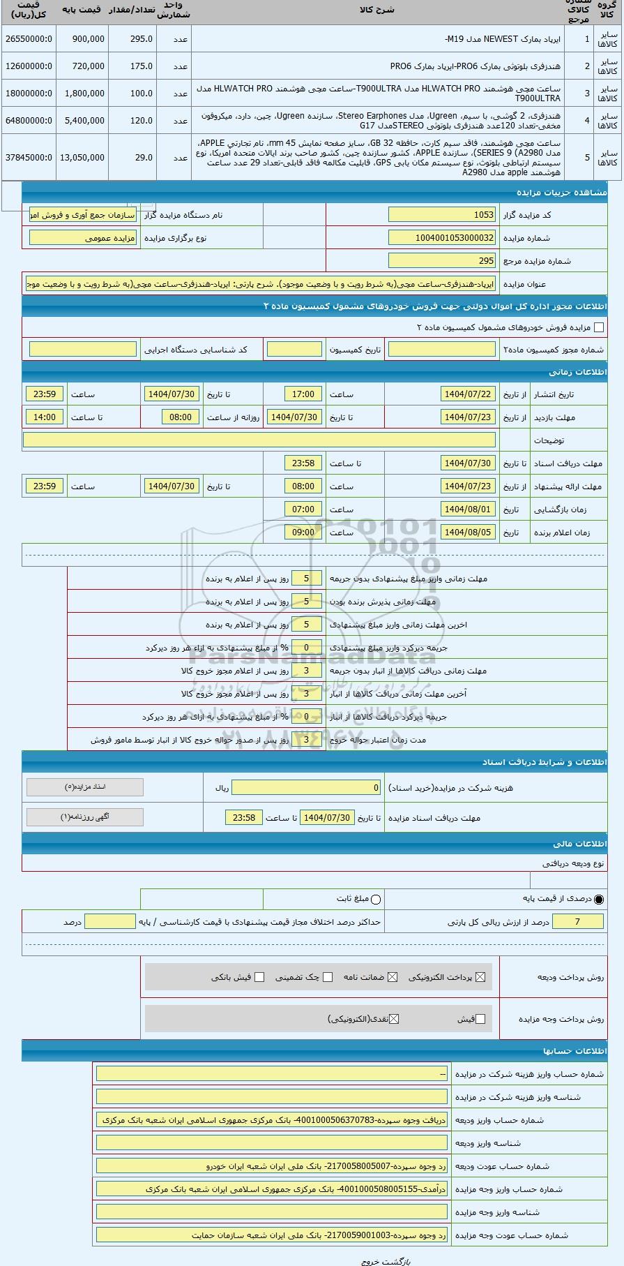 | کد مزایده گزار | 1053 | نام دستگاه مزایده گزار | سازمان جمع آوری و فروش اموال تملیکی | |