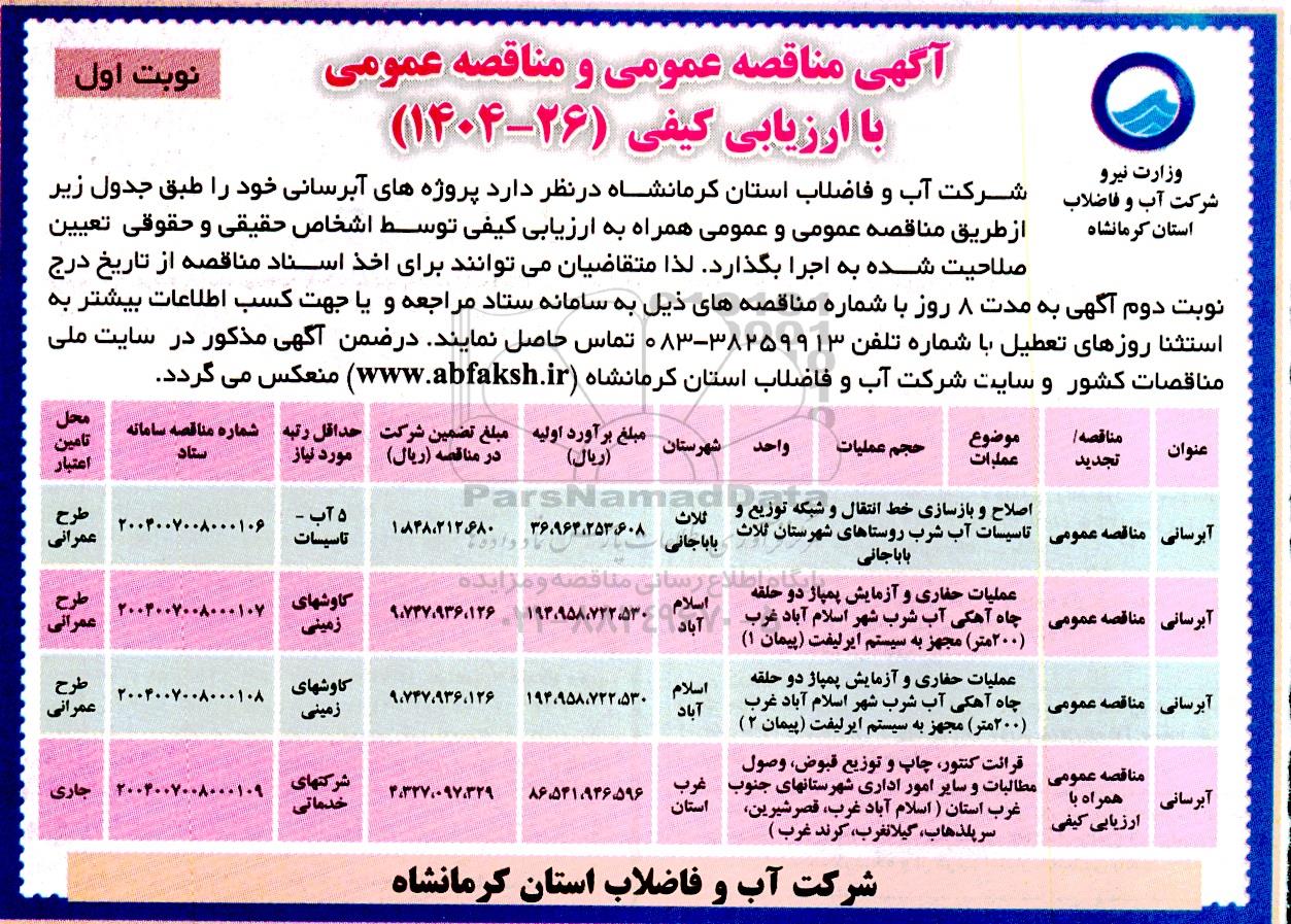 شرکت آب و فاضلاب استان کرمانشاه در نظر دارد پروژه های آبرسانی خود را طبق جدول زیر از طریق مناقصه عمومی و مناقصه عمومی همراه با ارزیابی کیفی توسط اشخاص حقیقی و حقوقی تعیین صلاحیت شده به اجرا بگذارد. لذا متقاضیان می توانند برای اخذ اسناد مناقصه از تاریخ درج نوبت دوم آگهی به مدت 8 روز با شماره مناقصه های ذیل به سامانه ستاد مراجعه و یا جهت کسب اطلاعات بیشتر به استثنا روزهای تعطیل با شماره تلفن 38259913 - 083 تماس حاصل نمایند. در ضمن آگهی مذکور در سایت ملی مناقصات کشور و سایت شرکت آب و فاضلاب استان کرمانشاه (www.abfaksh.ir) منعکس میگردد.