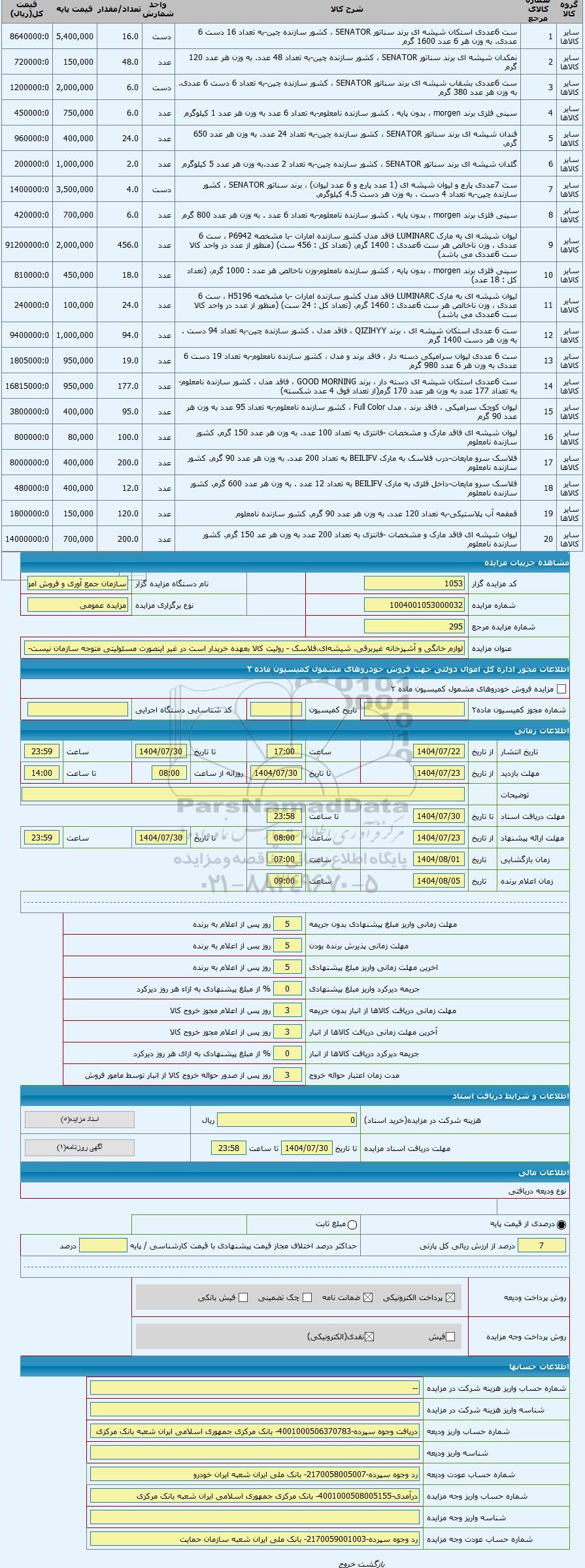 کد مزایده گزار1053نام دستگاه مزایده گزارسازمان جمع آوری و فروش اموال تملیکی