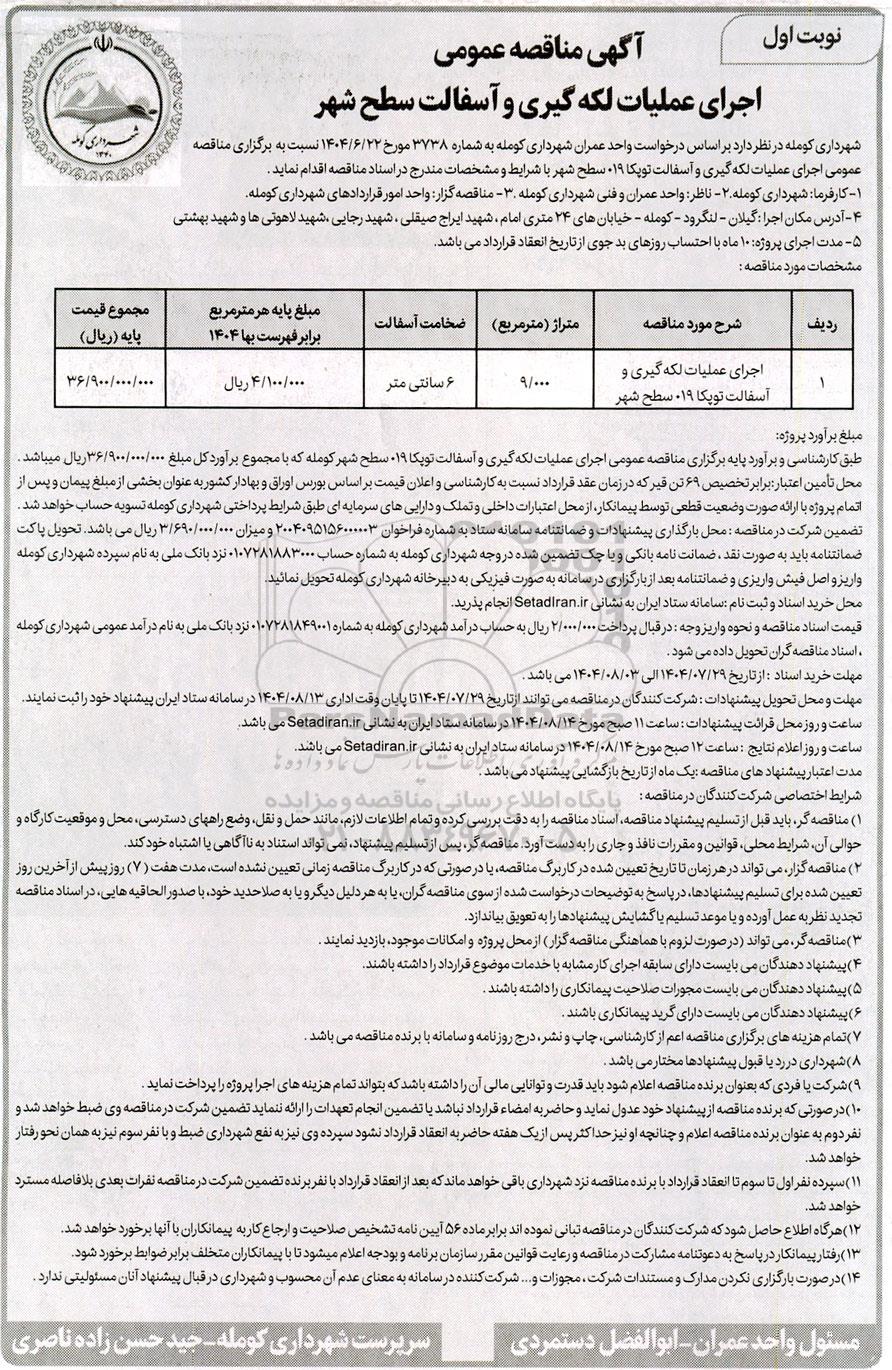 شهرداری کومله در نظر دارد بر اساس درخواست واحد عمران شهرداری کومله به شماره 3738 مورخ 1404.6.22 نسبت به برگزاری مناقصه عمومی اجرای عملیات لکه گیری و آسفالت توپکا 19 سطح شهر با شرایط و مشخصات مندرج در اسناد مناقصه اقدام نماید.