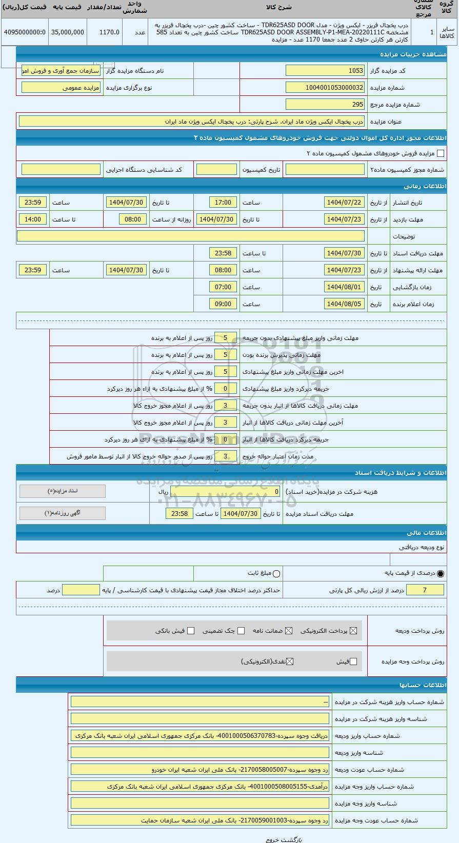 | کد مزایده گزار | 1053 | نام دستگاه مزایده گزار | سازمان جمع آوری و فروش اموال تملیکی | |