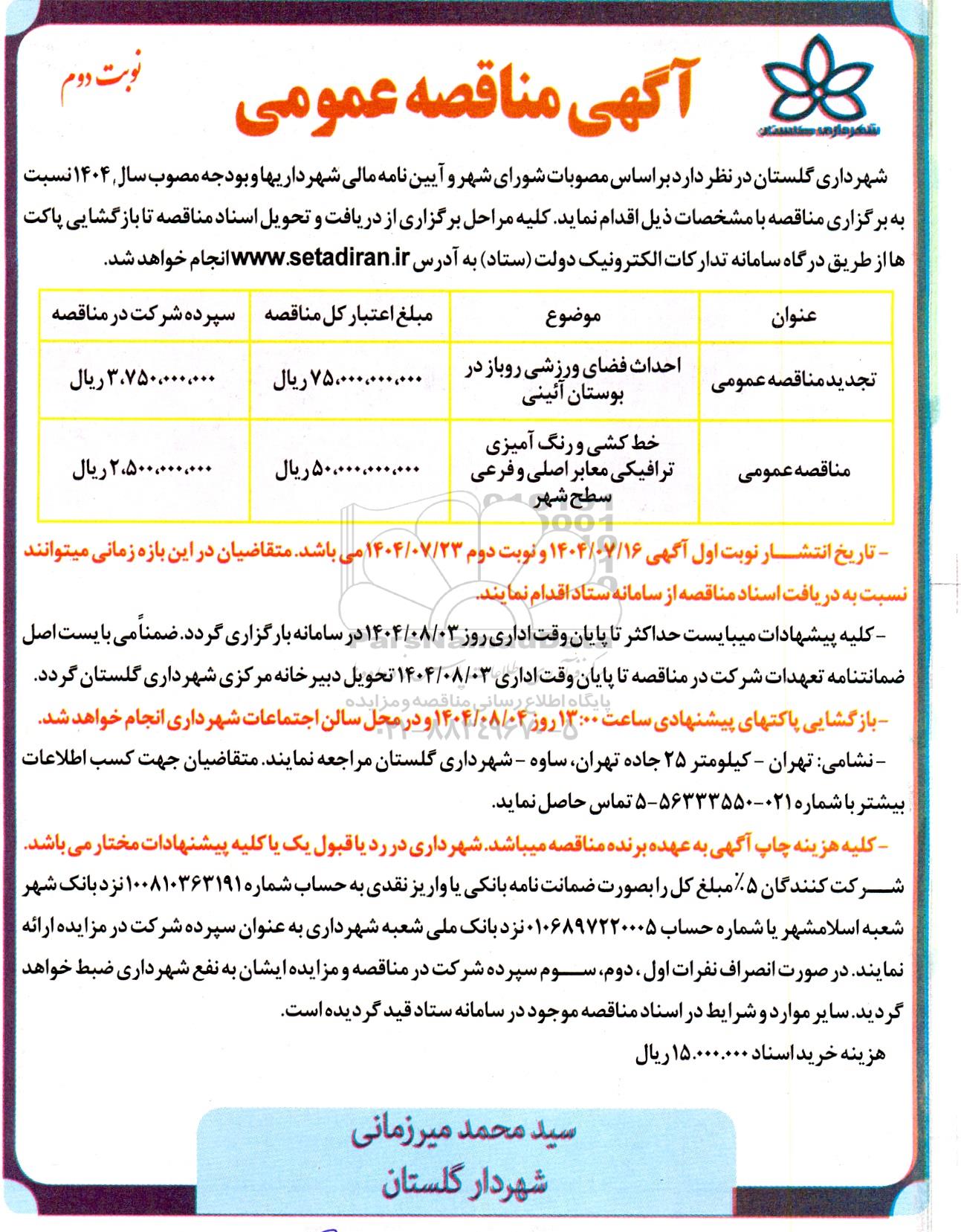 شهرداری گلستان در نظر دارد بر اساس مصوبات شورای شهر و آیین نامه مالی شهرداریها و بودجه مصوب سال 1403 نسبت به برگزاری مناقصه عمومی با مشخصات ذیل اقدام نماید. کلیه مراحل برگزاری از دریافت و تحویل اسناد مناقصه تا بازگشایی پاکتها از طریق درگاه سامانه تدارکات الکترونیک دولت (ستاد) به آدرس سایت ستاد ایران انجام خواهد شد