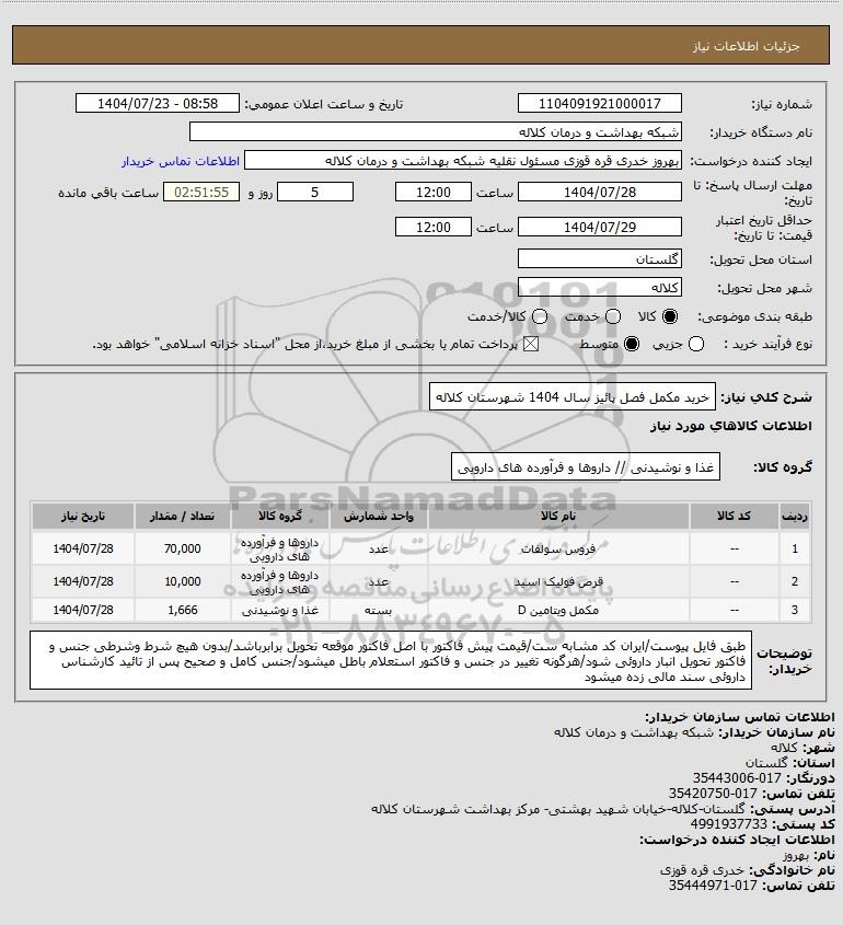 شرح کلی نیاز: خرید مکمل فصل پائیز سال 1404 شهرستان کلاله