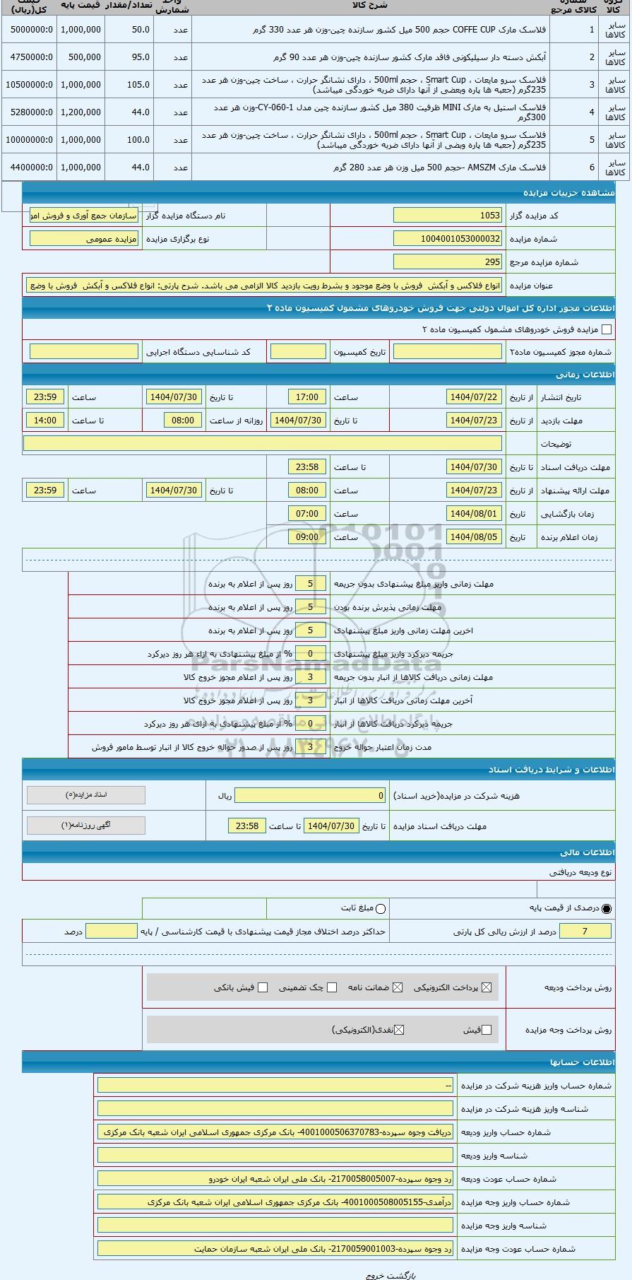 | کد مزایده گزار | 1053 | نام دستگاه مزایده گزار | سازمان جمع آوری و فروش اموال تملیکی | |