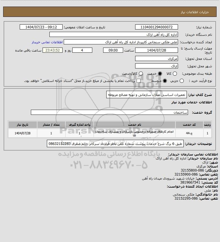 شرح کلی نیاز: تعمیرات اساسی منازل سازمانی و تهیه مصالح مربوطه