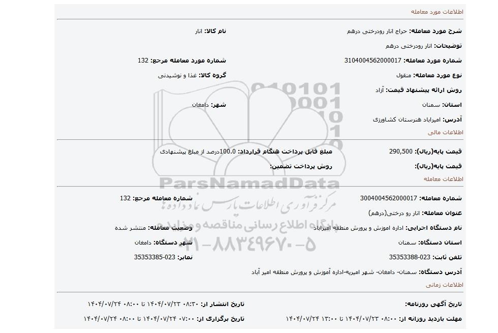 | شرح مورد معامله: حراج انار رودرختی درهم | نام کالا: انار | |