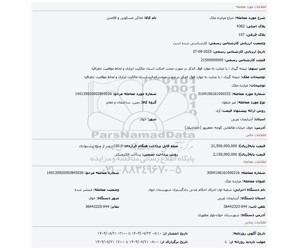| شرح مورد معامله: حراج مزایده ملک | نام کالا: اماکن مسکونی و اقامتی | |