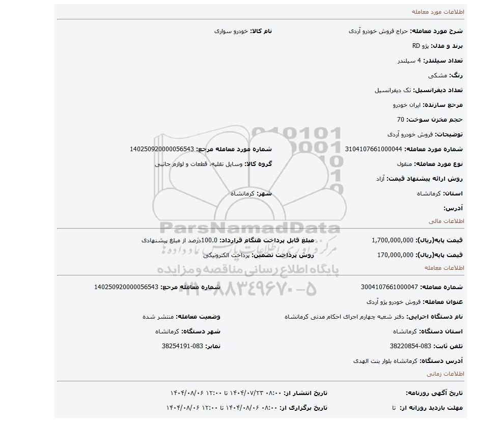 | عنوان معامله: فروش خودرو پژو آردی | ||