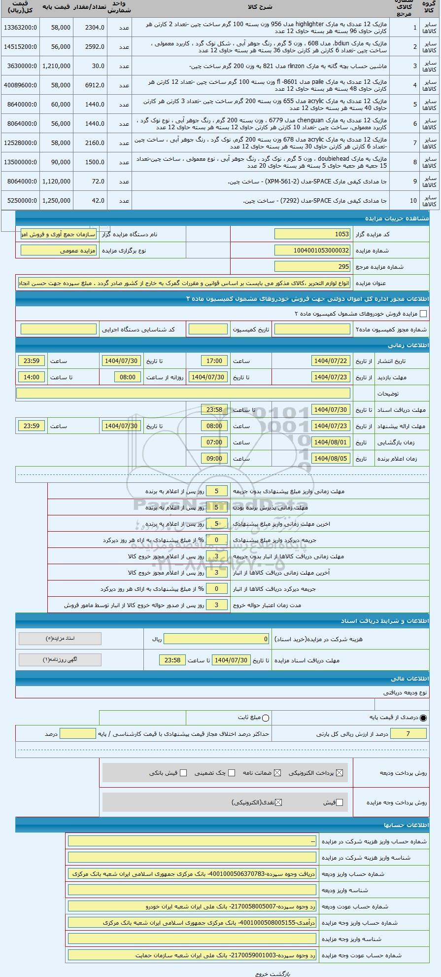 مزایده ، انواع لوازم التحریر ،کالای مذکور می بایست بر اساس قوانین و مقررات گمرک به خارج از کشور صادر گردد . مبلغ سپرده جهت حسن ا