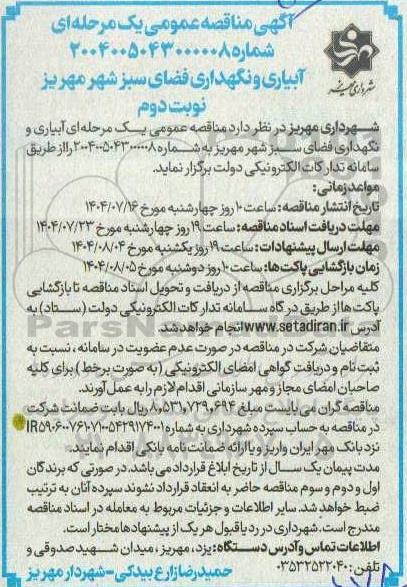 شهرداری مهریز در نظر دارد مناقصه عمومی یک مرحله ای آبیاری و نگهداری فضای سبز شهر مهریز به شماره 2004005043000008 را از طریق سامانه تدارکات الکترونیکی دولت برگزار نماید.