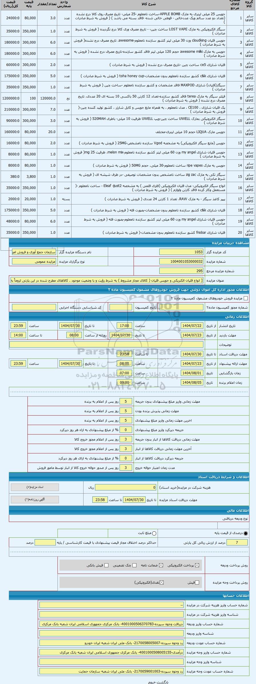 | عنوان مزایده | [ انواع قلیان الکتریکی و جویس قلیان ( کالای مجاز مشروط ) به شرط رؤیت و با وضعیت موجود . کالاهای مطرح شده در این پارتی لزوماً به خارج از کشور صادر می گردد . ( مناطق آزاد تجاری – صنعتی و ویژه اقتصادی به عنوان مقصد صادراتی محسوب نمی شوند . ) پس از ورود کالا به انبارهای موضوع ماده 23 امور گمرکی ، کالا مشمول مقررات امور گمرکی و اخذ مجوز های لازم خواهد بود . ضمناً تضمین خروج قطعی کالا از کشور ، سه برابر ارزش کل پارتی می باشد . لازم به ذکر است که در هنگام صدور حواله خروج کالا نام گمرک صادر کننده کالا توسط برنده مزایده به سازمان اعلام می شود . ] متقاضی با درج پیشنهاد قیمت در مزایده ، تمامی شروط درج شده در شرایط شرکت در مزایده اموال منقول ، مندرج در تارنمای سازمان به آدرس Tamliki.ir ( بخش مزایده و حراج ، قسمت مزایده اموال منقول ، آیکون شرایط شرکت در مزایده ) را می پذیرد . | |||