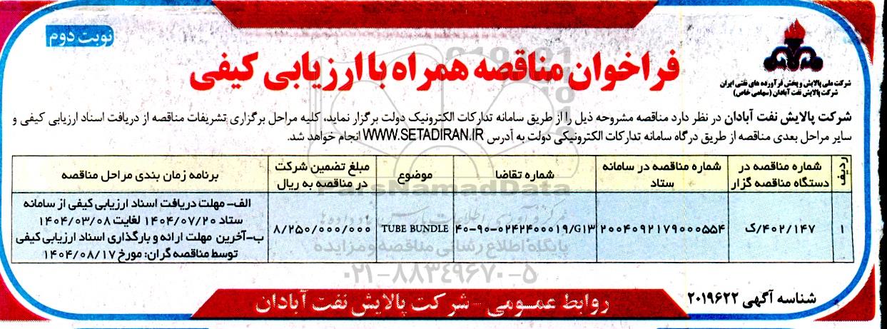مناقصه TUBE BUNDLE - نوبت دوم از کلیه افراد متخصص و شرکتها واجد شرایط دعوت به عمل میآید در مناقصه با کد خبرگزاری پارس نماد: 9702174 شرکت نمایند.