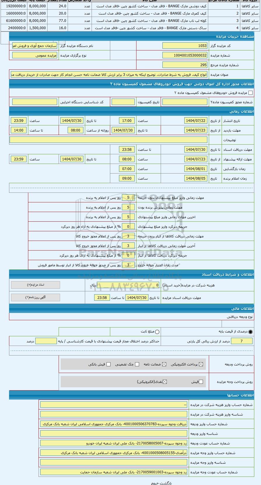 | کد مزایده گزار | 1053 | نام دستگاه مزایده گزار | سازمان جمع آوری و فروش اموال تملیکی | |