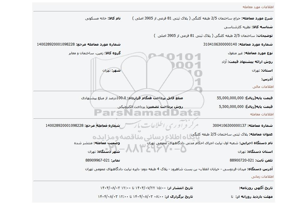 | شرح مورد معامله: حراج ساختمان 2/5 طبقه کلنگی ( پلاک ثبتی 81 فرعی از 3905 اصلی ) | نام کالا: خانه مسکونی | |