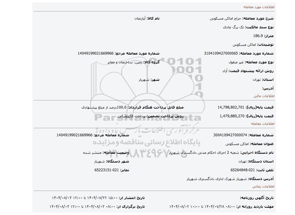 | شرح مورد معامله: حراج اماکن مسکونی | نام کالا: آپارتمان | |