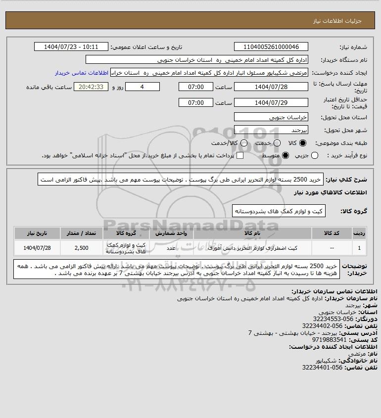 توضیحات خریدار:خرید 2500 بسته لوازم التحریر ایرانی طی برگ پیوست . توضیحات پیوست مهم می باشد .ارائه پیش فاکتور الزامی می باشد . همه هزینه ها تا رسیدن به انبار کمیته امداد خراسان جنوبی به آدرس بیرجند خیابان بهشتی 7 بر عهده برنده می باشد .