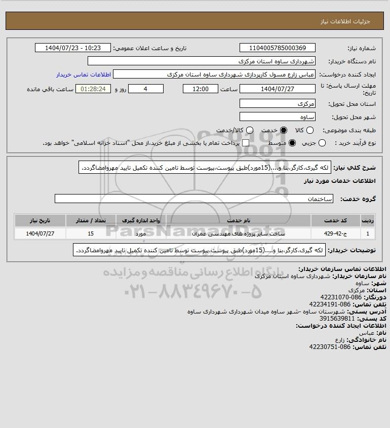 شرح کلی نیاز: لکه گیری،کارگر،بنا و....(15مورد)طبق پیوست،پیوست توسط تامین کننده تکمیل تایید مهروامضاگردد.