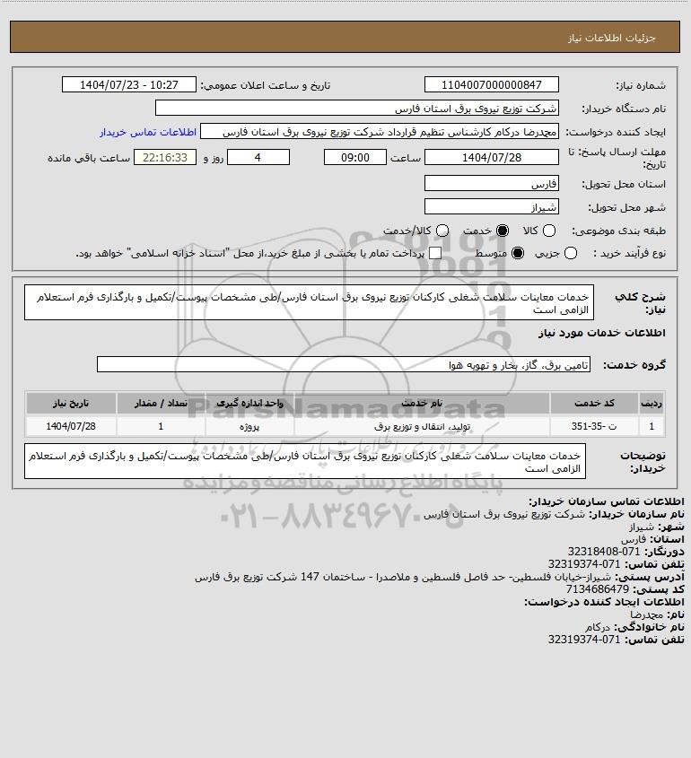 شرح کلی نیاز: خدمات معاینات سلامت شغلی کارکنان توزیع نیروی برق استان فارس/طی مشخصات پیوست/تکمیل و بارگذاری فرم استعلام الزامی است