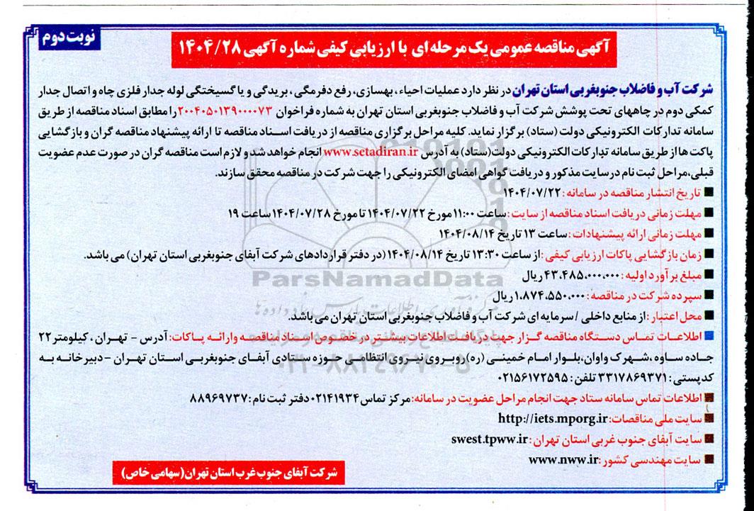 آگهی مناقصه عمومی یک مرحله ای با ارزیابی کیفی شماره آگهی 1404/28 نوبت دوم