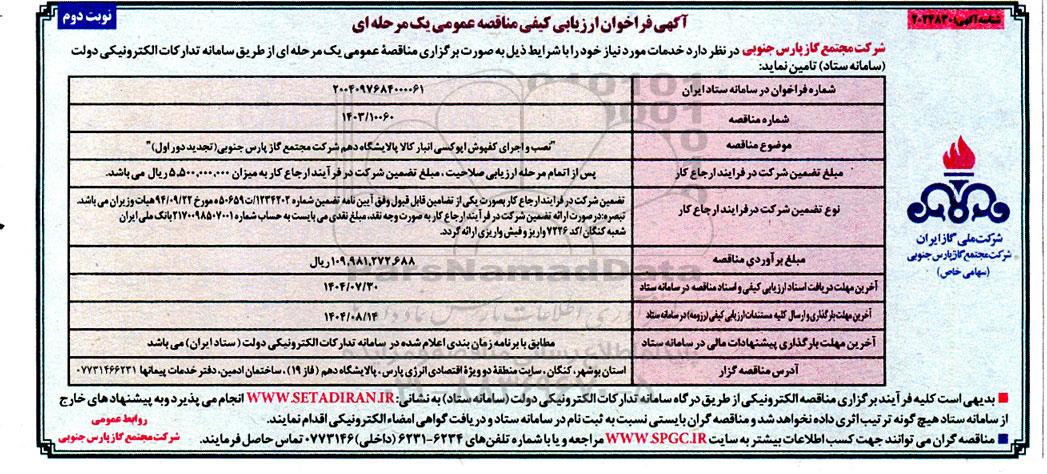 موضوع مناقصه: نصب و اجرای کفپوش اپوکسی انبار کالا پالایشگاه دهم شرکت مجتمع گاز پارس جنوبی (تجدید دور اول)