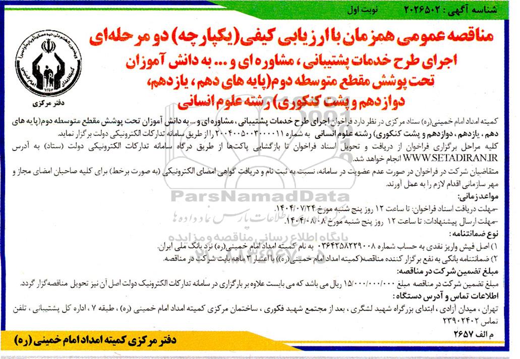 کمیته امداد امام خمینی (ره) ستاد مرکزی در نظر دارد فراخوان اجرای طرح خدمات پشتیبانی ، مشاوره ای و ... به دانش آموزان تحت پوشش مقطع متوسطه دوم (پایه های دهم، یازدهم، دوازدهم و پشت کنکوری) رشته علوم انسانی به شماره 2004005003000011 را از طریق سامانه تدارکات الکترونیکی دولت برگزار نماید. کلیه مراحل برگزاری فراخوان از دریافت و تحویل اسناد فراخوان تا بازگشایی پاکتها از طریق درگاه سامانه تدارکات الکترونیکی دولت (ستاد) به آدرس ستاد ایران انجام خواهد شد. متقاضیان شرکت در فراخوان در صورت عدم عضویت در سامانه نسبت به ثبت نام و دریافت گواهی امضای الکترونیکی به صورت برخط برای کلیه صاحبان امضای مجاز و مهر سازمانی اقدام لازم را به عمل آورند.