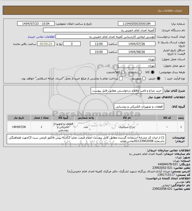 شرح کلی نیاز: خرید چراغ و لامپ واقلام درخواستی مطابق فایل پیوست