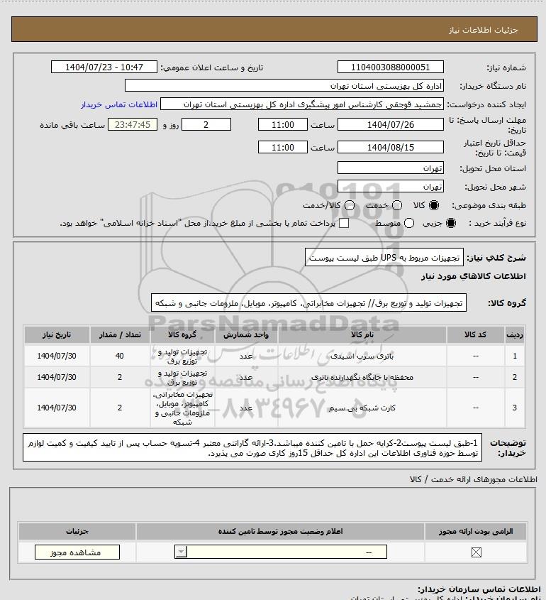 شرح کلی نیاز: تجهیزات مربوط به UPS طبق لیست پیوست