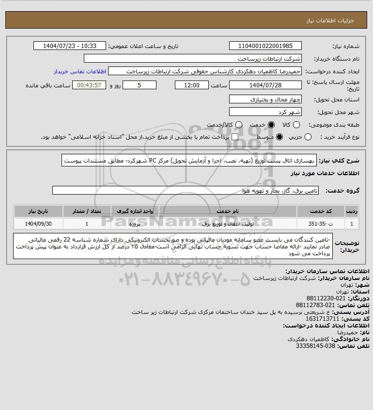 شرح کلی نیاز: بهسازی اتاق پست توزیع (تهیه، نصب، اجرا و آزمایش تحویل) مرکز PC شهرکرد- مطابق مستندات پیوست