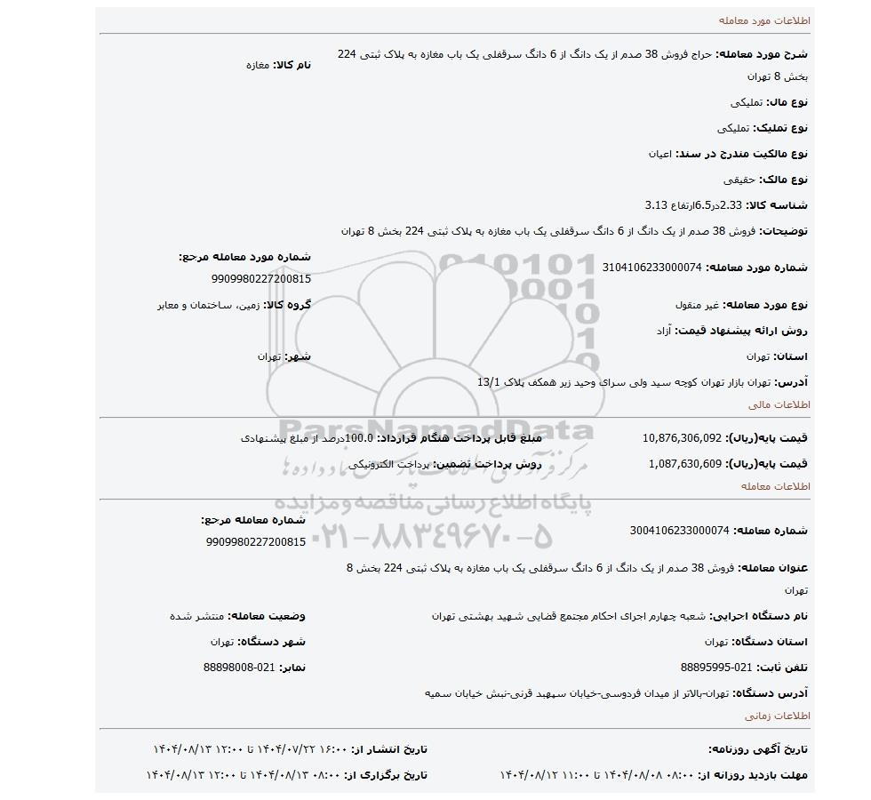 | شماره مورد معامله: 3104106233000074 | شماره مورد معامله مرجع: 9909980227200815 | |