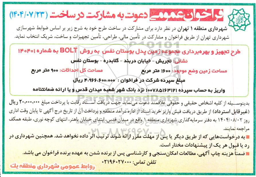 شهرداری منطقه 1 تهران در نظر دارد برای مشارکت در ساخت طرح خود به شرح زیر بر اساس ضوابط شهرسازی شهرداری تهران از طریق فراخوان و مشارکت در تأمین مالی ، طراحی ، تأمین تجهیزات و ساخت، شریک انتخاب نماید.