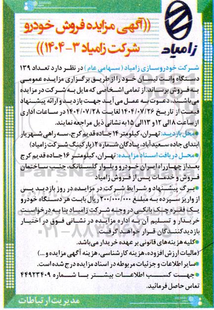 آگهی مزایده فروش خودرو شرکت زامیاد 3-1404