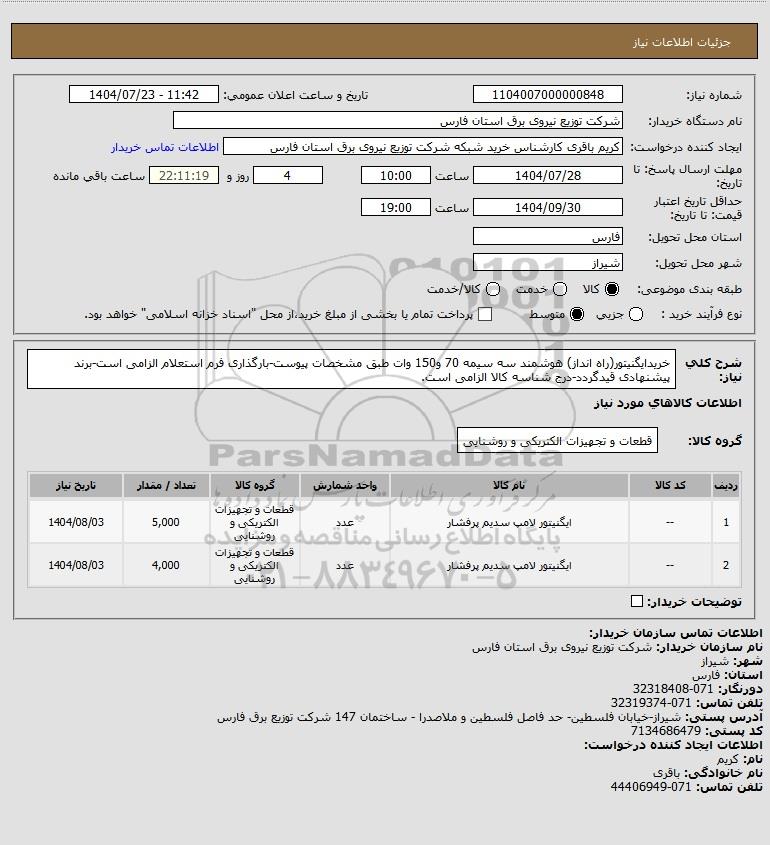 | 2 | -- | ایگنیتور لامپ سدیم پرفشار | عدد | قطعات و تجهیزات الکتریکی و روشنایی | 4,000 | 1404/08/03 |