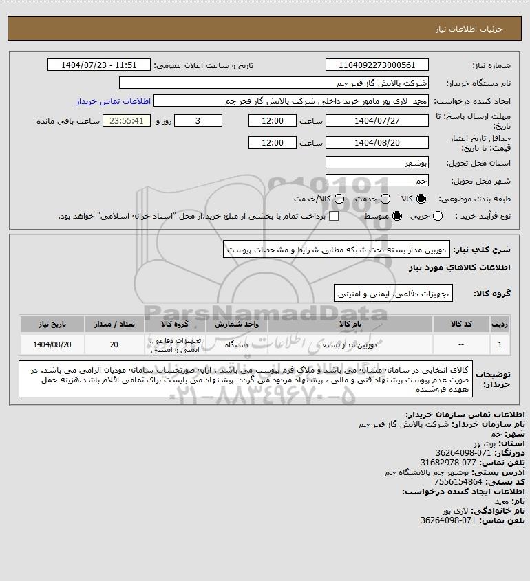 | 1 | -- | دوربین مدار بسته | دستگاه | تجهیزات دفاعی، ایمنی و امنیتی | 20 | 1404/08/20 |