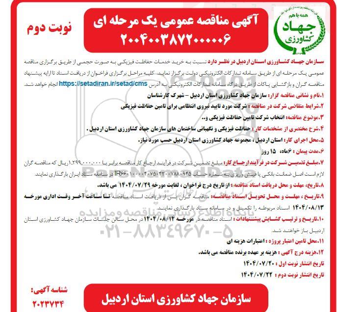 سازمان جهاد کشاورزی استان اردبیل در نظر دارد نسبت به خرید خدمات حفاظت فیزیکی به صورت حجمی از طریق برگزاری مناقصه عمومی یک مرحله ای از طریق سامانه تدارکات الکترونیکی دولت برگزار نماید. کلیه مراحل برگزاری فراخوان از دریافت اسناد تا ارائه پیشنهاد مناقصه گران و بازگشایی پاکت ها از طریق درگاه سامانه تدارکات الکترونیکی دولت ستاد به آدرس سایت ستاد ایران انجام خواهد شد.