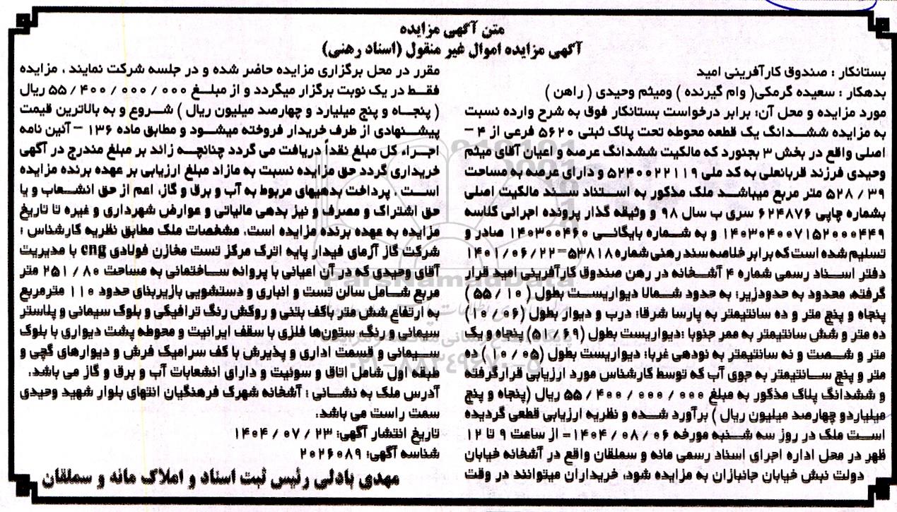 آگهی مزایده اموال غیر منقول (اسناد رهنی)
