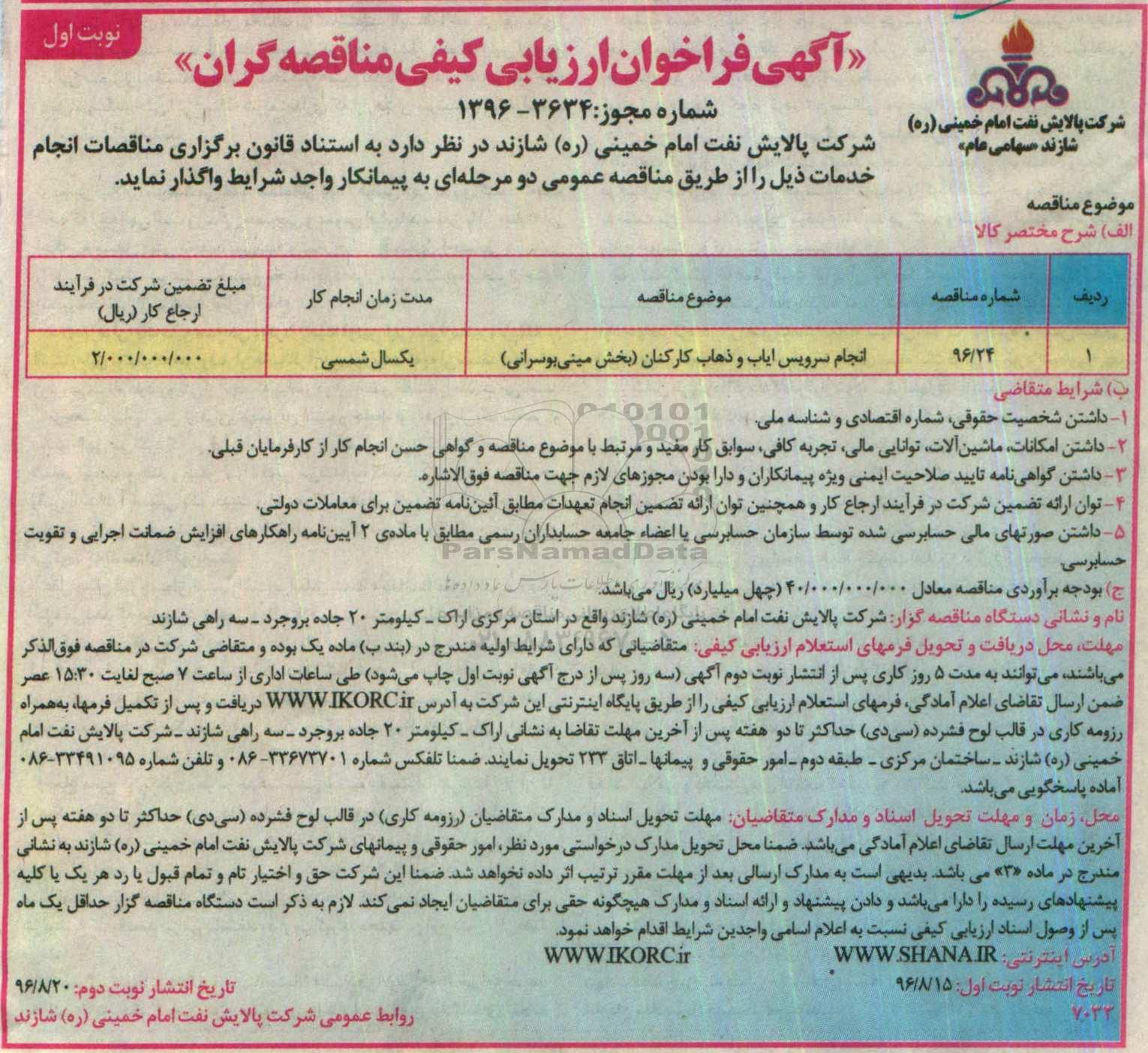 شرکت پالایش نفت امام خمینی (ره) شازند در نظر دارد به استناد قانون برگزاری مناقصات انجام خدمات ذیل را از طریق مناقصه عمومی دو مرحله ای به پیمانکار واجد شرایط واگذار نماید.