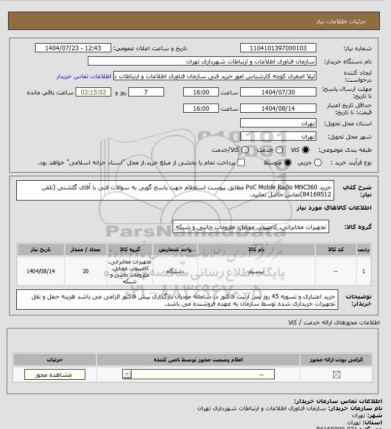 شرح کلی نیاز: خرید PoC Mobile Radio MNC360 مطابق پیوست استعلام