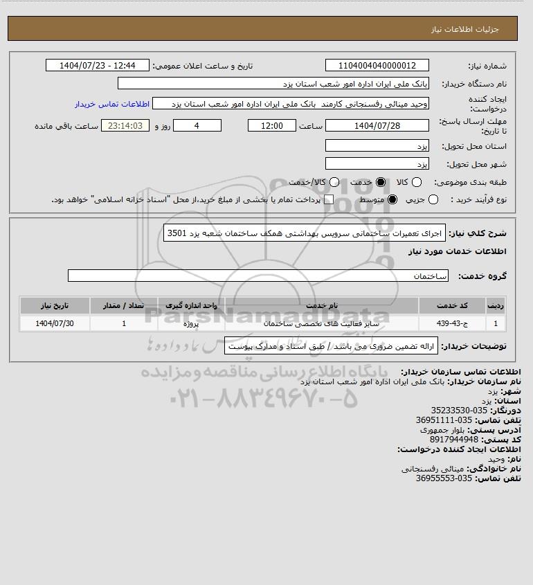 شرح کلی نیاز: اجرای تعمیرات ساختمانی سرویس بهداشتی همکف ساختمان شعبه یزد 3501