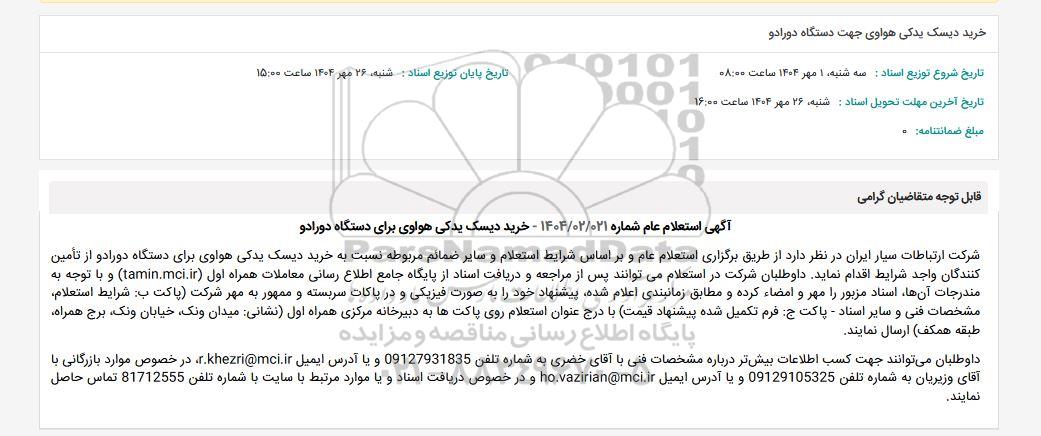 شرکت ارتباطات سیار ایران در نظر دارد از طریق برگزاری استعلام عام و بر اساس شرایط استعلام و سایر ضمائم مربوطه نسبت به خرید دیسک یدکی هواوی برای دستگاه دورادو از تأمین کنندگان واجد شرایط اقدام نماید. داوطلبان شرکت در استعلام می توانند پس از مراجعه و دریافت اسناد از پایگاه جامع اطلاع رسانی معاملات همراه اول (tamin.mci.ir) و با توجه به مندرجات آنها، اسناد مزبور را مهر و امضاء کرده و مطابق زمانبندی اعلام شده، پیشنهاد خود را به صورت فیزیکی و در پاکات سربسته و ممهور به مهر شرکت (پاکت ب: شرایط استعلام، مشخصات فنی و سایر اسناد - پاکت ج: فرم تکمیل شده پیشنهاد قیمت) با درج عنوان استعلام روی پاکت ها به دبیرخانه مرکزی همراه اول (نشانی: میدان ونک، خیابان ونک، برج همراه، طبقه همکف) ارسال نمایند.