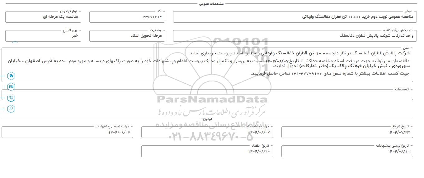 علاقمندان می توانند جهت دریافت اسناد مناقصه حداکثر تا تاریخ 1404.08.07 نسبت به بررسی و تکمیل مدارک پیوست اقدام وپیشنهادات خود را به صورت پاکتهای دربسته و مهرو موم شده به آدرس اصفهان، خیابان سهروردی، نبش خیابان فرهنگ پلاک یک (دفتر تدارکات) تحویل نمایند.