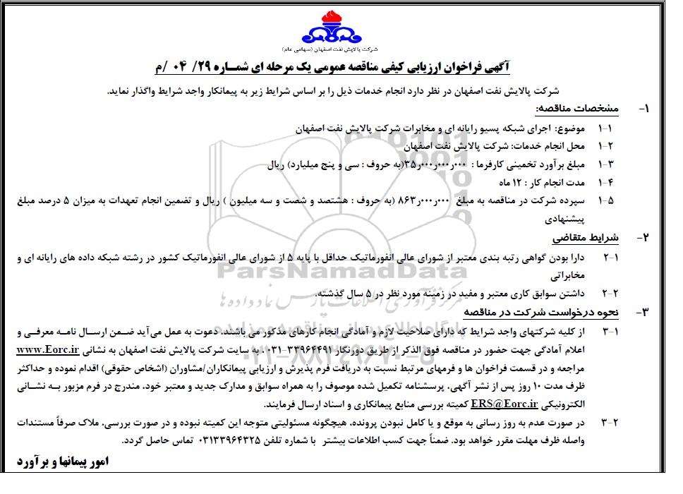 آگهی فراخوان ارزیابی کیفی مناقصه عمومی یک مرحله ای شماره 04/29/م