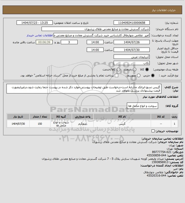 نام دستگاه خریدار:شرکت گسترش معادن و صنایع معدنی طلای زرشوران